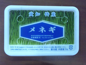 めねぎ(芽葱)はうなぎの肝吸いに愛称が良いことから、戦前より栽培されるようになりました。栽培方法は、土耕栽培のものを「芽葱」、水耕栽培のものを「姫葱」と呼んでいます。写真の芽葱は愛知県の「安藤農園」で栽培されているもので、ガラス温室で作られています。温室栽培のため年間通しての安定出荷が可能となります。発芽した種を狭い砂場に敷き詰めることにより細い葱が育ちます。夏場で20日、冬場で25日位の周期で収穫できるようになります。見ての通りとても繊細な葱なので、収穫作業からパック詰めまでほとんどの作業が手作業で手間隙かけてひとつずつ丁寧に作っています。香りが高いのが特徴で、最近ではお寿司などにそのまま使われています。