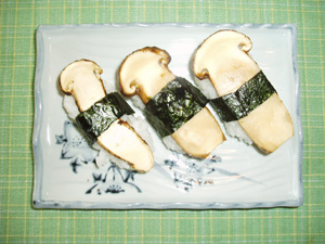 なかちゃん : 松茸を少し厚めにスライスします。だし汁で軽く湯通しした物、あるいは少し火で焙り白醤油で付け焼きにした物を酢飯と握り、海苔で帯をして完成です。