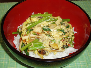 なかちゃん : 先ほどの炒め物をさらに卵でとじて丼物も作ってみました。