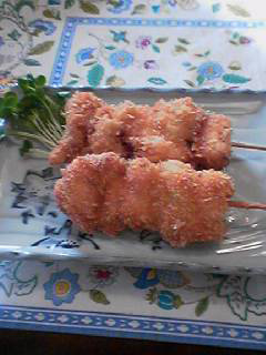 なかちゃん : まず鶏肉を一口大に切り、塩胡椒をします。ねぎの白根部分を2cmくらいにぶつ切りにして串に鶏肉と交互に刺していきます。後は小麦粉、卵、パン粉をつけて揚げれば完成です。なんというか…ふつうの串カツの要領ですね。