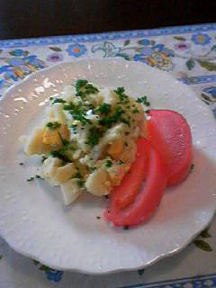 なかちゃん : お鍋に適当に切ったジャガイモを入れてやわらかく茹でます。ゆで卵も作っておきましょう。チャイブを細かく刻みます。茹でたジャガイモと卵をつぶしてよく混ぜ合わせます。お好みの量のマヨネーズと塩胡椒で味を調えたらお皿に切ったトマトと盛り付けて完成!おっと最後に刻んだチャイブを散らすのをお忘れなく。