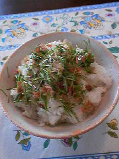 なかちゃん : 芽ねぎは1cmくらいに切ります。切った芽ねぎと鰹節を良く混ぜて醤油をお好みの量たらします。あとはご飯の上にふりかけていただきます。味付け海苔で巻いて食べるとおいしそうです。