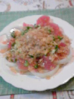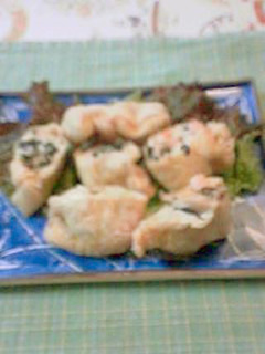 ゆりちゃん : アロエベラってはじめて食べるんだけど、アロエヨーグルトに入ってるのと同じなのね。苦味が強いのかと思ったら全然気にならなくておいしくいただけましたよ(^^)v ピーナッツと胡麻を使ったのがポイントですね。春巻きの皮のパリパリ感もサイコー! 中華風ドレッシングの相性も良くていきなり大成功の一品が出来ました♥ 見た目もとってもおいしそうでしょ? 玉葱は泣きながら私が切ったんですよぉ。でも太めになっちゃいました…わたしと一緒♥ でもこのぶきっちょさが逆に食欲をそそったりするんです!! (スライサーを使えばよかったかな…)