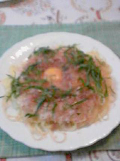 なかちゃん : そろそろ手がかゆくなりはじめてきましたが、伊勢芋はまたすりおろします。丸い芋なんで少しおろしづらいですね…めんつゆでお好みの味付けをしておきます。茹でたスパゲッティの上に味付けした伊勢芋のおろしたのをのせます。その上から卵黄、なめ茸、大葉の千切り、花かつおをトッピングして出来上がりです!