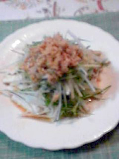 なかちゃん : 水菜は4cmくらいに切ります。大根は薄く輪切りにしてから千切りにして冷水にさらしてから水気をよくふき取ります。長芋は酢水につけておいてから太目の千切りにします。ドレッシングは今回は手作りで!まず、みりんを電子レンジで20秒加熱をしてからの残りの醤油、水、酢と混ぜます。簡単なんだけどおいしいですよ! 後は野菜を盛り付け、納豆をのせてからドレッシングをかけて完成で~す。