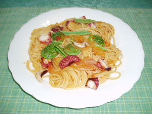 なかちゃん : こごみは先にさっと茹でておきます。タコは食べやすい大きさに切ります。トマトはさいの目に切り、玉葱はスライスします。スパゲッティは少し硬めに茹でた方がいいですね。フライパンに油を敷いて、にんにくをみじん切りにしたもの、玉葱、トマトの順番に炒めていきます。次に固形スープの素を砕いて入れ、そこにトマトケチャップ、酒、塩を入れて味を整えます。最後にスパゲッティ、こごみ、タコを入れて混ぜ合わせながらもう少し炒めて完成です。