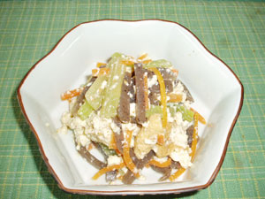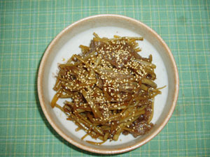 なかちゃん : またまたメインのおかずにはなりずらい一品かなぁ…ゴメンネゆりちゃん。牛肉は2cm幅に切り、うどと牛蒡は太めの千切りにして酢水につけておきます。鍋に胡麻油を熱して牛肉、牛蒡、うどの順番で炒めます。残りの調味料を加えて汁気がなくなるまで煮ます。最後に一味唐辛子と煎り胡麻を振れば完成です。