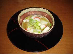D : お次はこしあぶらですね。ちょっとクセのある香りが特徴ですので、汁物にしてみました。少しトロミを加えて仕上げてみました。まずはだし汁から…これもお好みで結構なのですが、薄味にしたほうがお上品な味になりますね。こしあぶらは付け根の硬い部分を落とします。ちいさいこしあぶらだとバラバラになりますがかまいません。大根は時間があるかたは米のとぎ汁で茹でておくとよいですが、時間のない方はラップして「チン」でも問題ありません。汁が煮立ったら大根、こしあぶら、細かく刻んだエリンギ、いちょう切りにしたかまぼこを加えて10分ほど煮込んで最後に水溶き片栗粉を入れてトロミをつければ完成です。大根の代わりに蕪を使ってもよいのではないでしょうか?