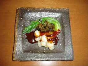 D : 今度はのびるです。天婦羅とかがポピュラーなのですがそれではおもしろくないので味噌和えにしてみました。もともとネギとかわけぎに近い山菜なので味噌とよく合います。のびるは葉先の硬い部分を切り、1分ほど茹でて冷水にさらしておきます。和える味噌はスーパーなどで売っている田楽味噌みたいなものに、みりんを加えてまろやかな味にします。お好みで豆板醤を加えてピリ辛にします。水にさらしたのびるはよく絞って水気を取り高菜と一緒に盛り付けます。最後にピリ辛味噌をかけて出来上がり!!