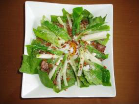 S : ロメインレタスの歯ごたえは非常によいのですが、うるいはさらにそれを上回る歯ごたえがありますね。歯ごたえだけじゃなくて、噛んだ後にヌルッとぬめりがあります。このぬめりが温泉卵とからまってとってもおいしいです。山菜もサラダに使えるんですね~。味はもちろん歯ごたえまで楽しめるサラダです。